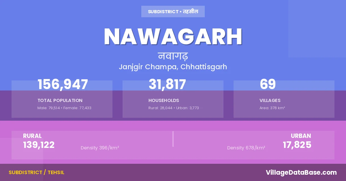 Nawagarh is a town and Tehsil in the Janjgir Champa district of the Chhattisgarh. In India, a Tehsil is a subdivision of a district responsible for the administration and revenue collection of a specific area within the district. Tehsils play a crucial role in the local governance structure, contributing significantly to the development and administration of their communities.