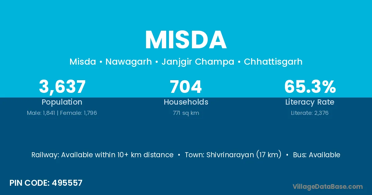 Shivrinarayan (17 km) is the nearest town to Misda village for major economic activities and is located approximately 17 km away.