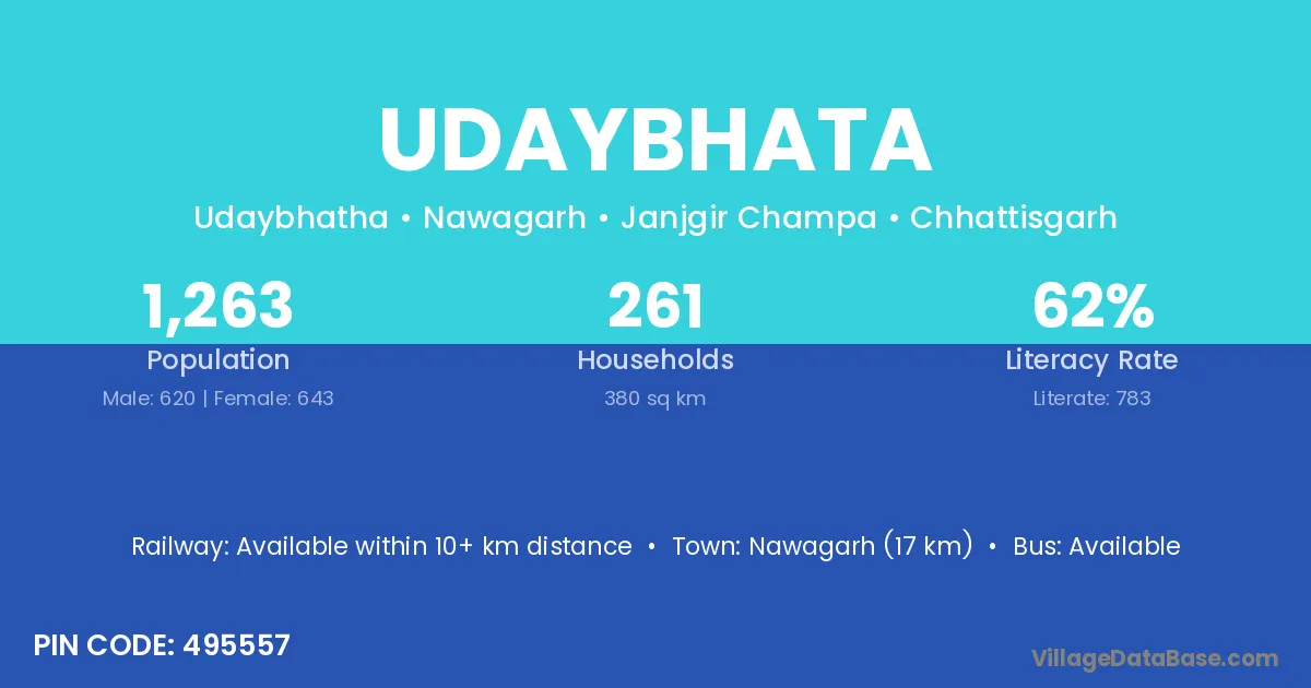 Nawagarh (17 km) is the nearest town to Udaybhata village for major economic activities and is located approximately 17 km away.