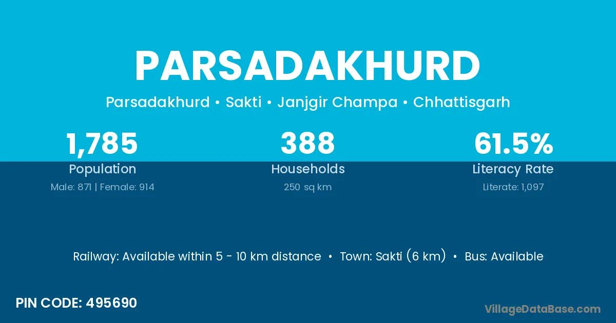 Sakti (6 km) is the nearest town to Parsadakhurd village for major economic activities and is located approximately 6 km away.