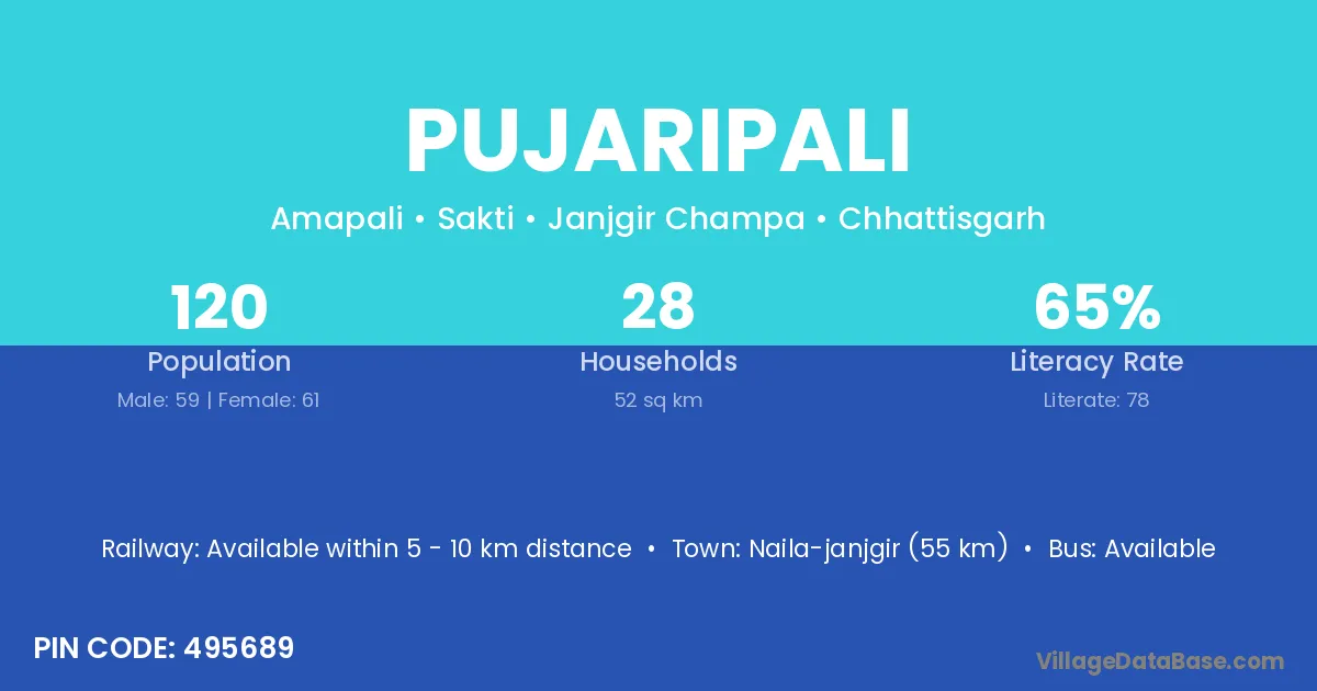 Naila-janjgir (55 km) is the nearest town to Pujaripali village for major economic activities and is located approximately 55 km away.