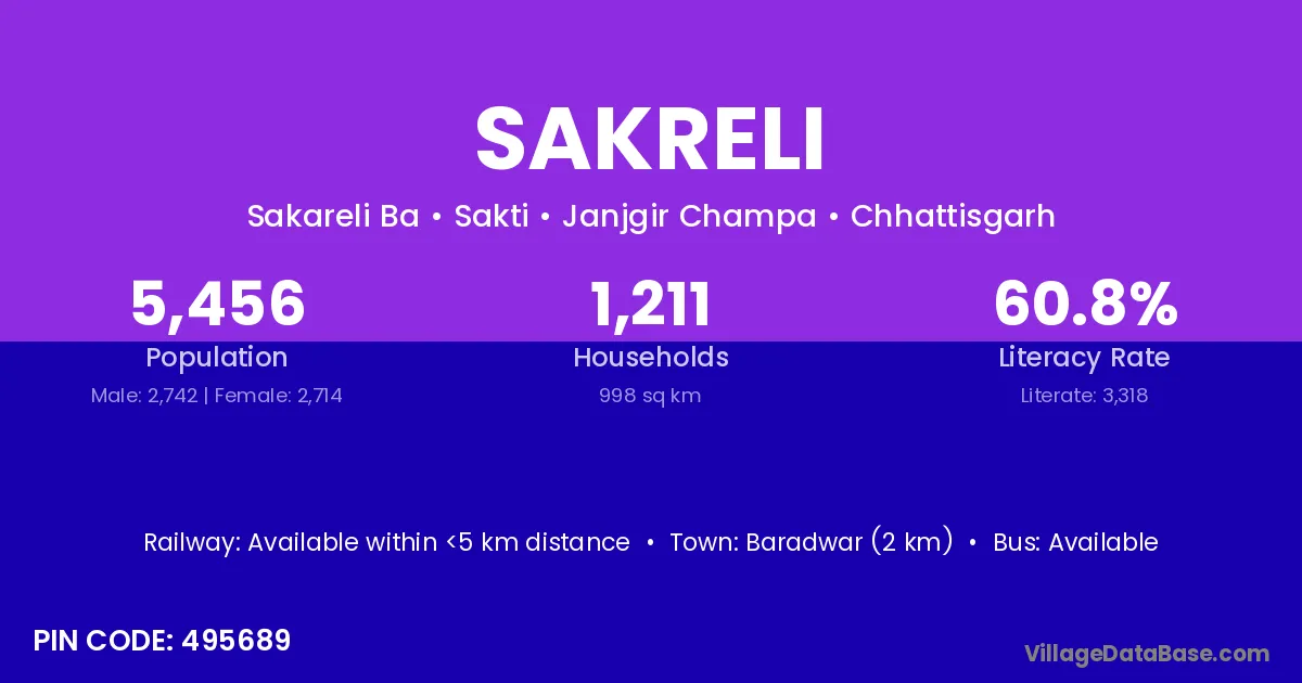 According to Census 2011 information, the village code of Sakreli village is 495689.
