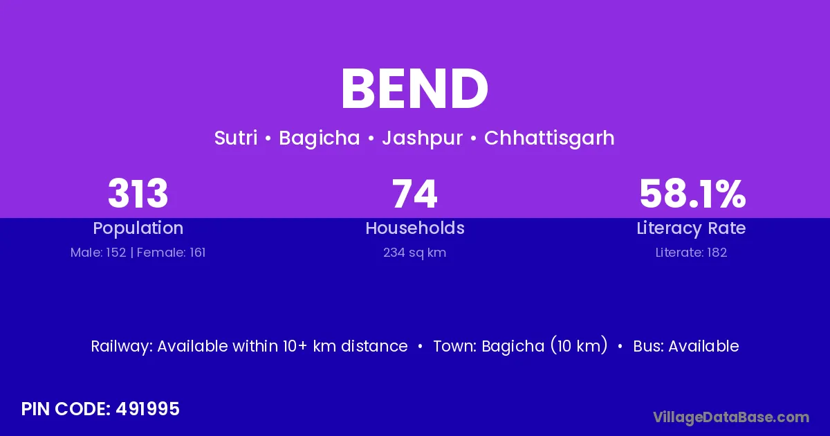Bagicha (10 km) is the nearest town to Bend village for major economic activities and is located approximately 10 km away.