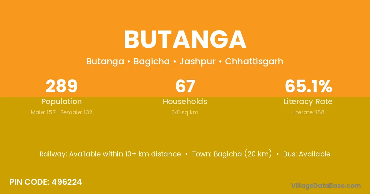 Butanga village is located in the Bagicha Tehsil of the Jashpur district in Chhattisgarh .