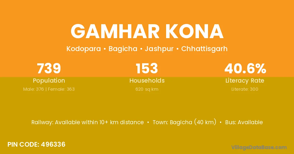 Bagicha (40 km) is the nearest town to Gamhar Kona village for major economic activities and is located approximately 40 km away.