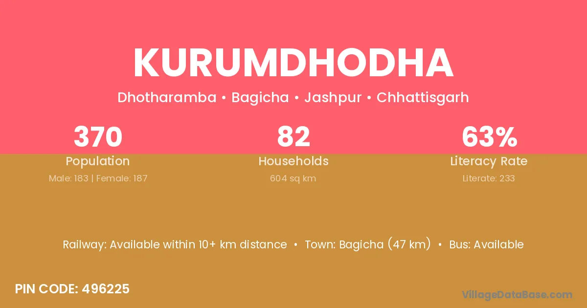 Bagicha (47 km) is the nearest town to Kurumdhodha village for major economic activities and is located approximately 47 km away.
