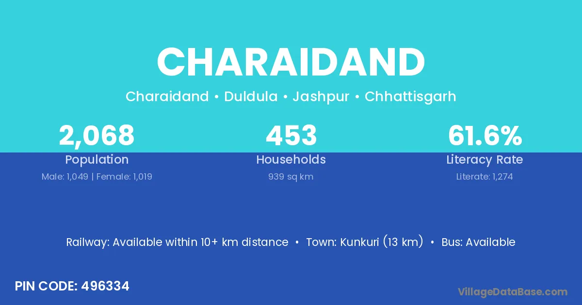 Kunkuri (13 km) is the nearest town to Charaidand village for major economic activities and is located approximately 13 km away.