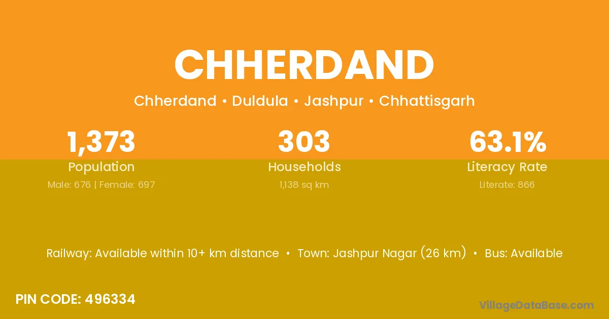 Jashpur Nagar (26 km) is the nearest town to Chherdand village for major economic activities and is located approximately 26 km away.