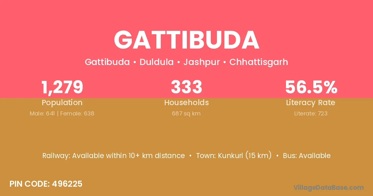 Gattibuda village has a total population of 1,279 people, of which 641 are males and 638 are females.