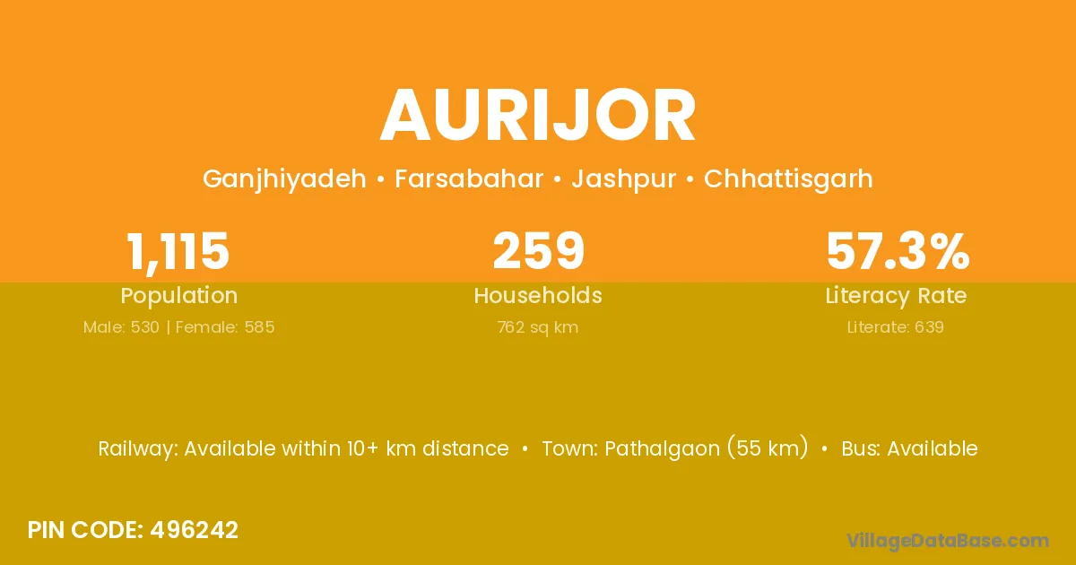 Pathalgaon (55 km) is the nearest town to Aurijor village for major economic activities and is located approximately 55 km away.