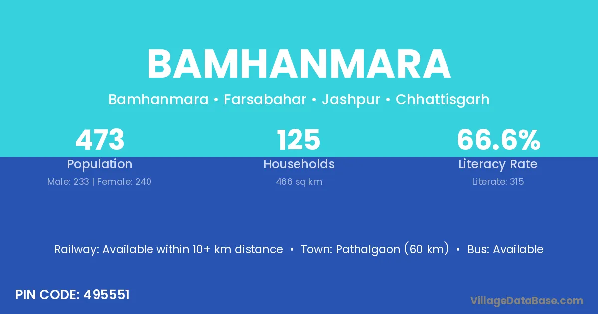 Pathalgaon (60 km) is the nearest town to Bamhanmara village for major economic activities and is located approximately 60 km away.