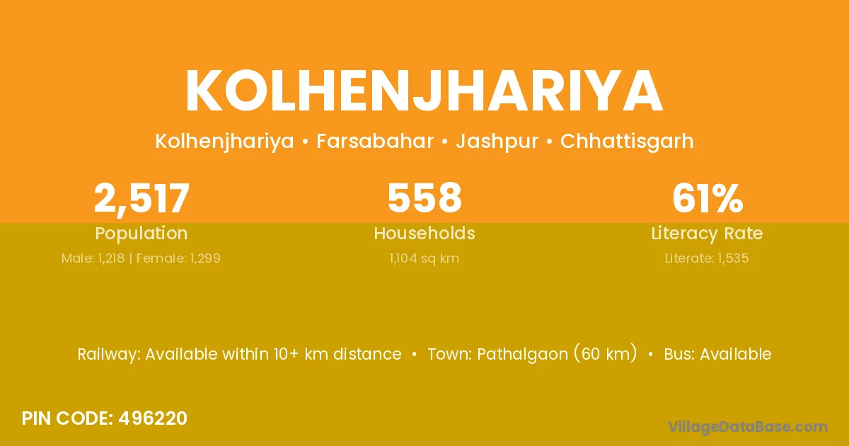 Pathalgaon (60 km) is the nearest town to Kolhenjhariya village for major economic activities and is located approximately 60 km away.