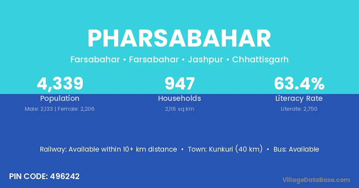 Kunkuri (40 km) is the nearest town to Pharsabahar village for major economic activities and is located approximately 40 km away.