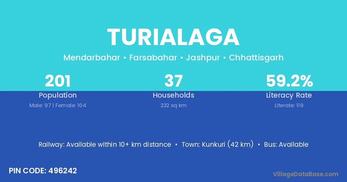 Kunkuri (42 km) is the nearest town to Turialaga village for major economic activities and is located approximately 42 km away.