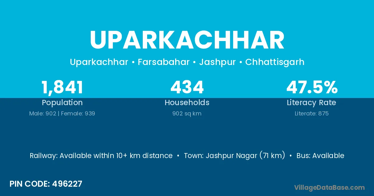 Jashpur Nagar (71 km) is the nearest town to Uparkachhar village for major economic activities and is located approximately 71 km away.