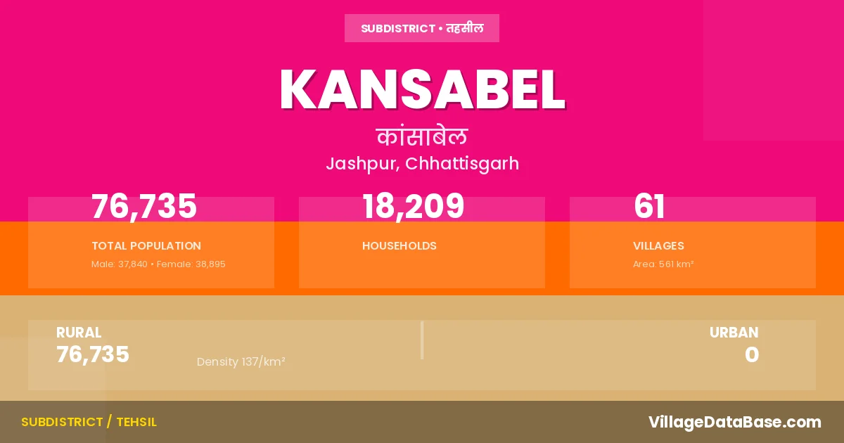 According to the 2011 census The total area of Kansabel Tehsil is 561 km², with a population of 76735 people. The population density is 137 inhabitants per square kilometre, and there are approximately 18209 houses in the sub district.