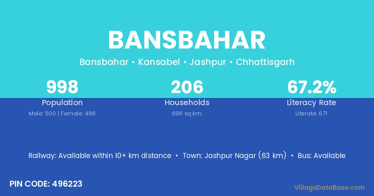 Bansbahar village has a total population of 998 people, of which 500 are males and 498 are females.