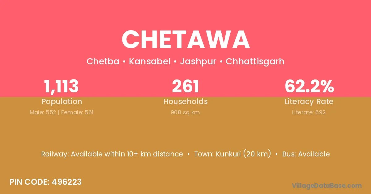 Kunkuri (20 km) is the nearest town to Chetawa village for major economic activities and is located approximately 20 km away.