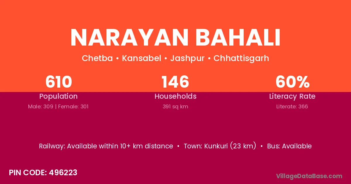 Narayan Bahali village has a total population of 610 people, of which 309 are males and 301 are females.