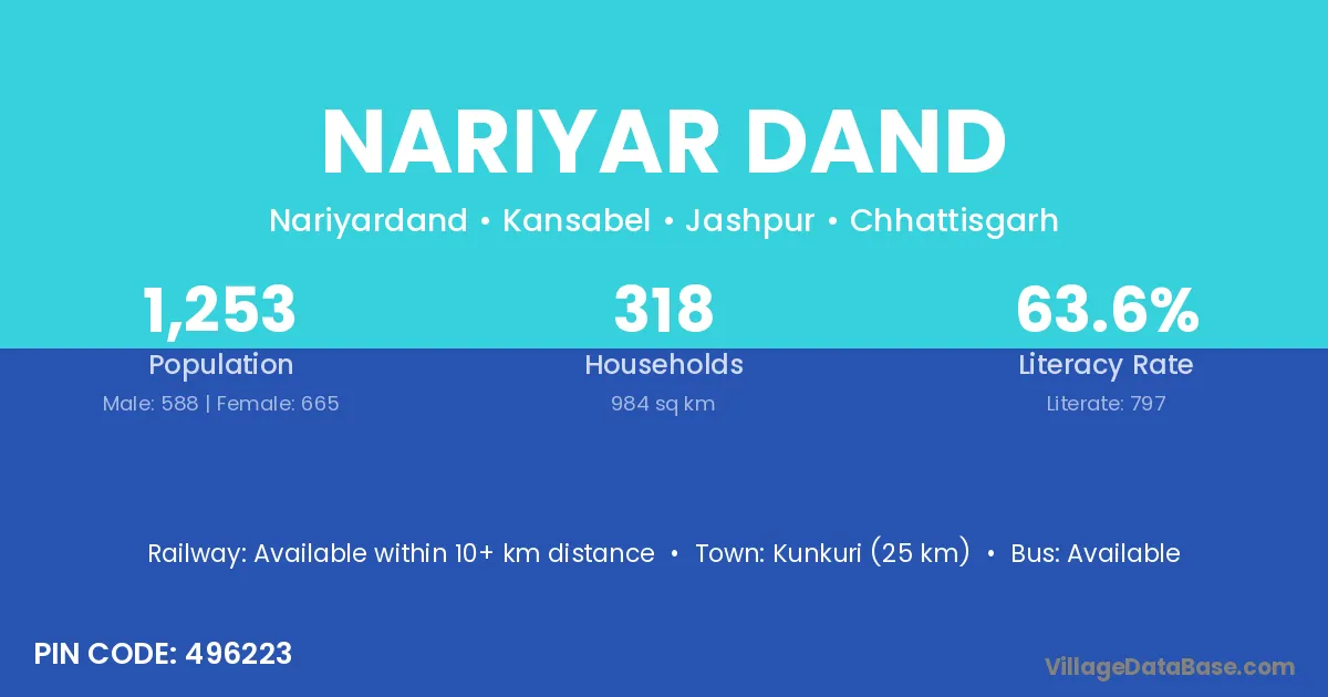 Kunkuri (25 km) is the nearest town to Nariyar Dand village for major economic activities and is located approximately 25 km away.
