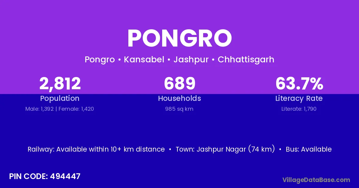 Jashpur Nagar (74 km) is the nearest town to Pongro village for major economic activities and is located approximately 74 km away.