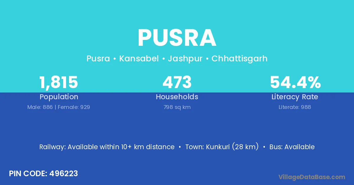 Kunkuri (28 km) is the nearest town to Pusra village for major economic activities and is located approximately 28 km away.