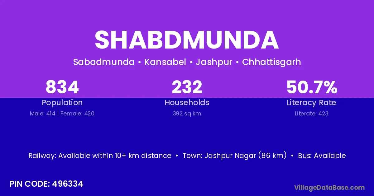 Shabdmunda village is located in the Kansabel Tehsil of the Jashpur district in Chhattisgarh .