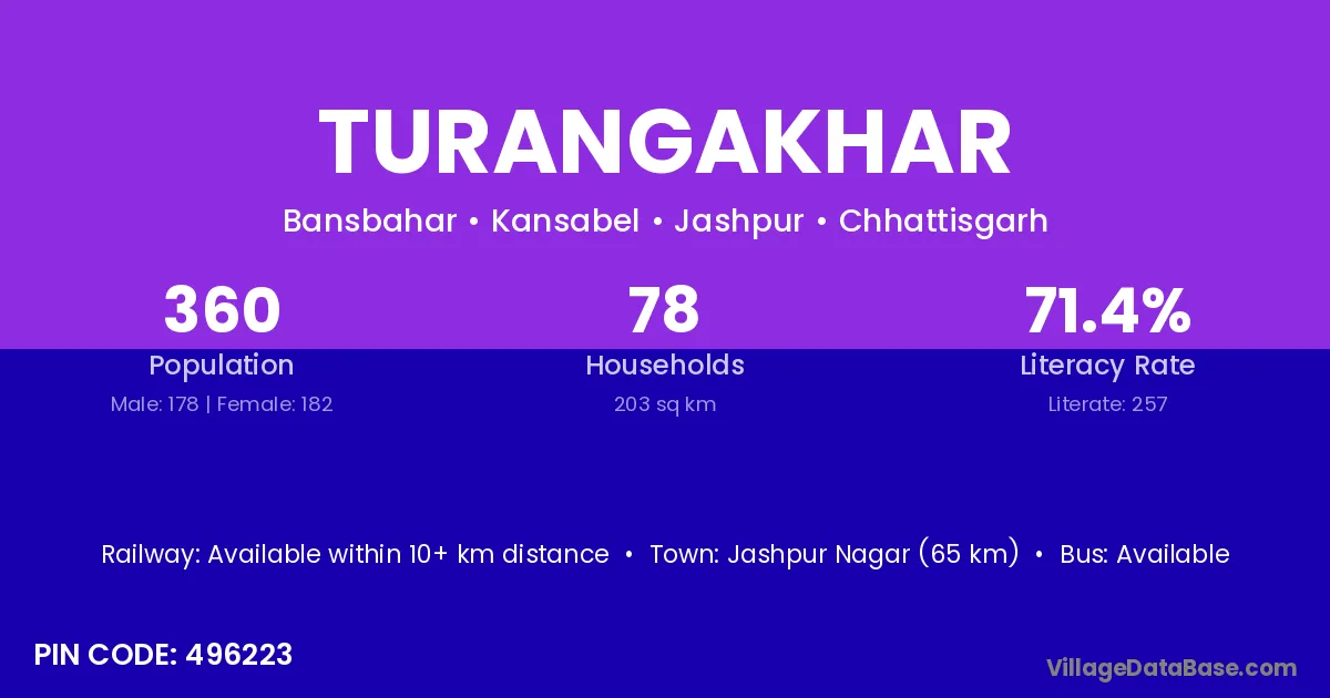 Jashpur Nagar (65 km) is the nearest town to Turangakhar village for major economic activities and is located approximately 65 km away.