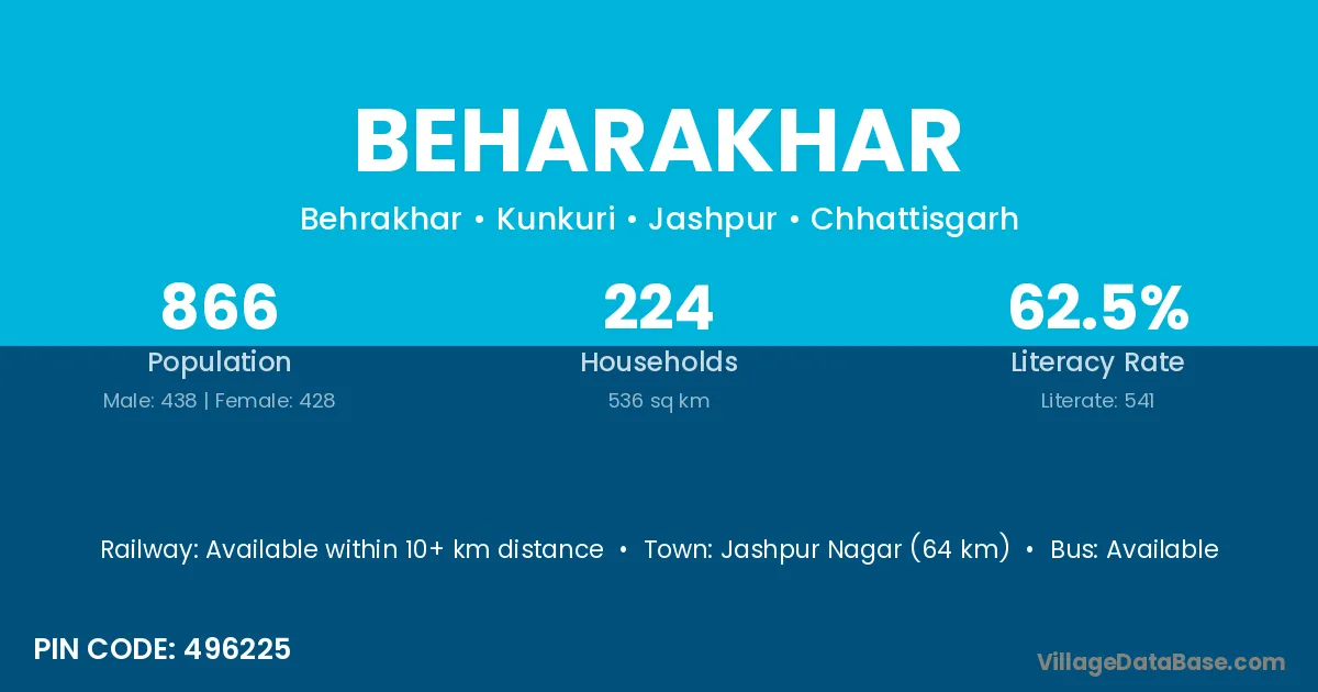 Jashpur Nagar (64 km) is the nearest town to Beharakhar village for major economic activities and is located approximately 64 km away.