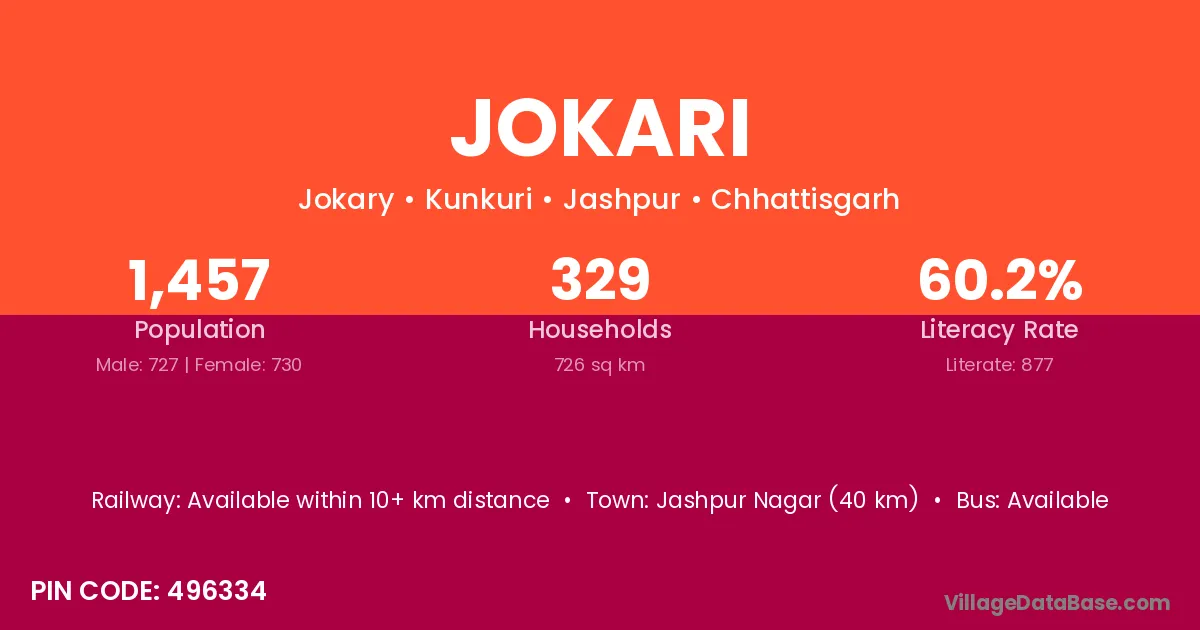 Jashpur Nagar (40 km) is the nearest town to Jokari village for major economic activities and is located approximately 40 km away.