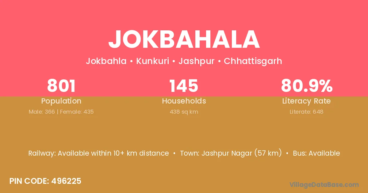 Jashpur Nagar (57 km) is the nearest town to Jokbahala village for major economic activities and is located approximately 57 km away.