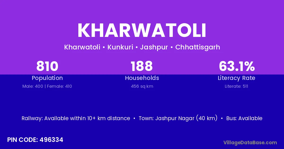 Jashpur Nagar (40 km) is the nearest town to Kharwatoli village for major economic activities and is located approximately 40 km away.