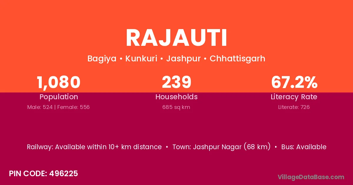 Jashpur Nagar (68 km) is the nearest town to Rajauti village for major economic activities and is located approximately 68 km away.