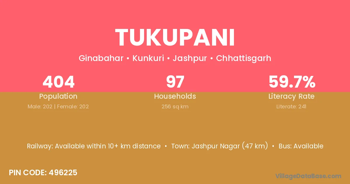 Tukupani village has a total population of 404 people, of which 202 are males and 202 are females.
