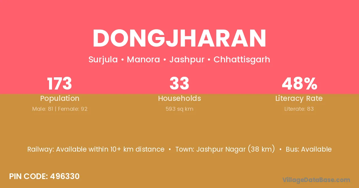 Jashpur Nagar (38 km) is the nearest town to Dongjharan village for major economic activities and is located approximately 38 km away.