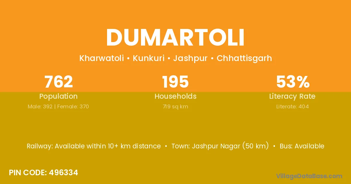 Jashpur Nagar (8 km) is the nearest town to Dumartoli village for major economic activities and is located approximately 8 km away.