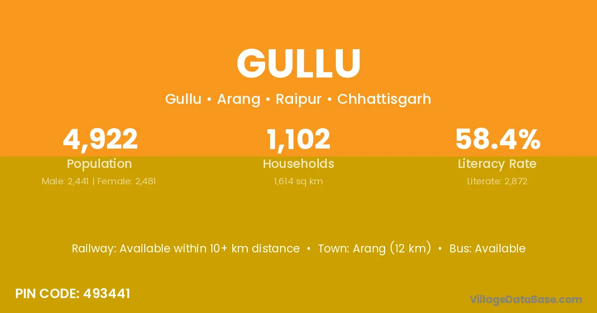 Jashpur Nagar (42 km) is the nearest town to Gullu village for major economic activities and is located approximately 42 km away.