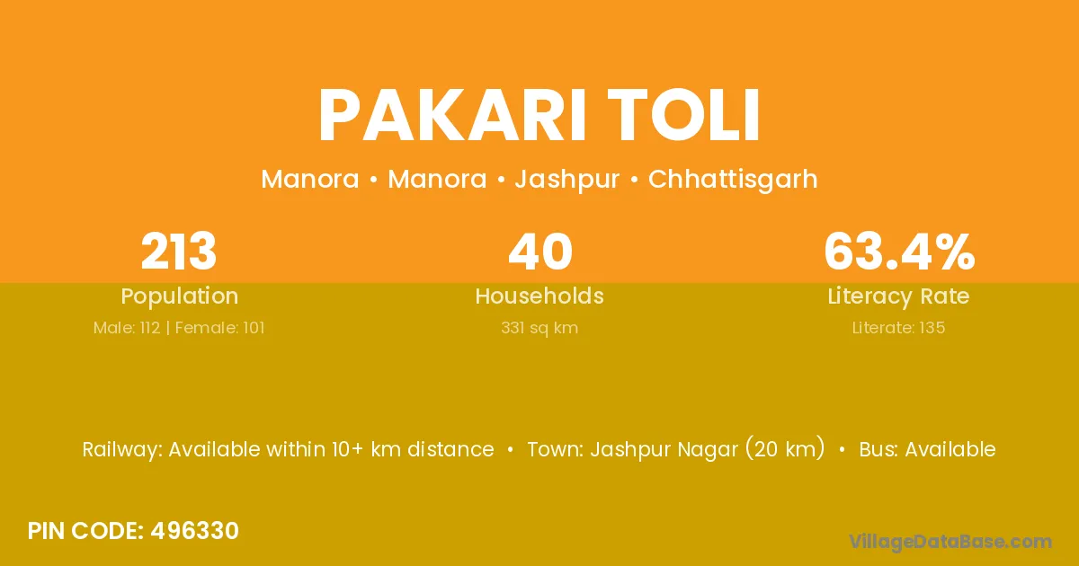 Jashpur Nagar (20 km) is the nearest town to Pakari Toli village for major economic activities and is located approximately 20 km away.