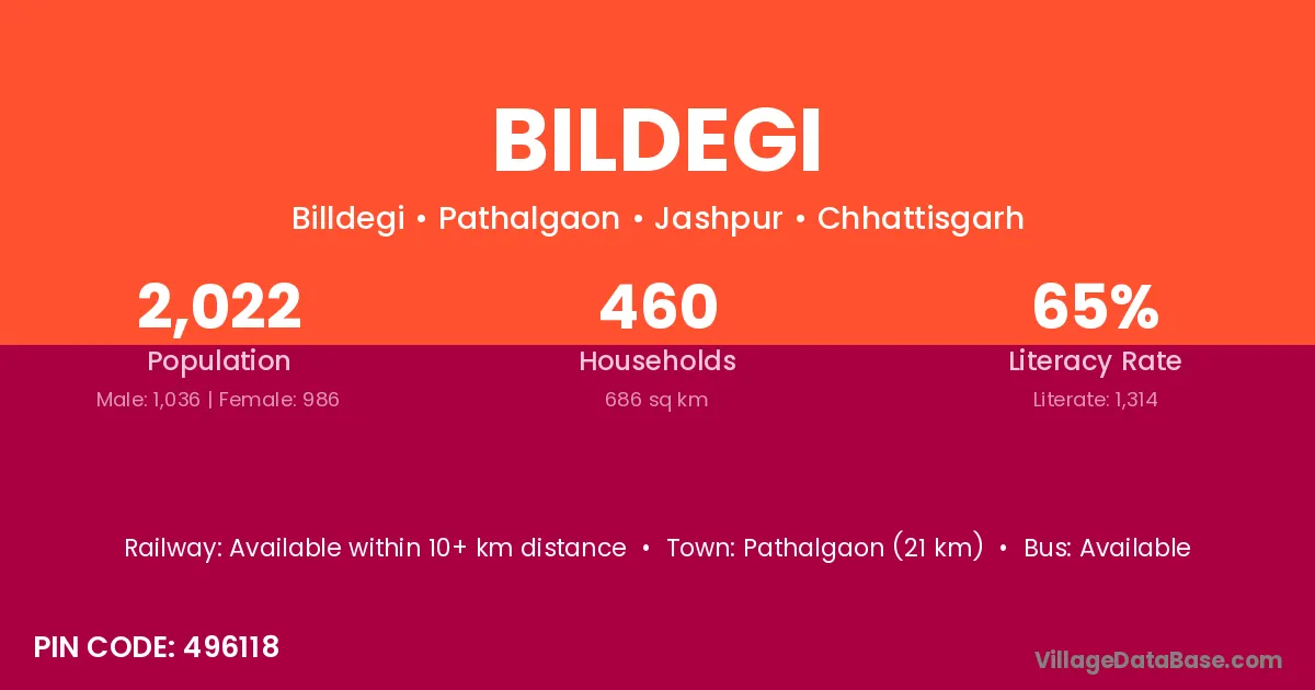 Bildegi village is located in the Pathalgaon Tehsil of the Jashpur district in Chhattisgarh .
