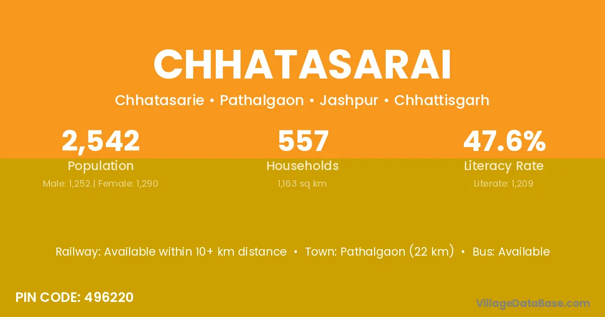 Pathalgaon (22 km) is the nearest town to Chhatasarai village for major economic activities and is located approximately 22 km away.