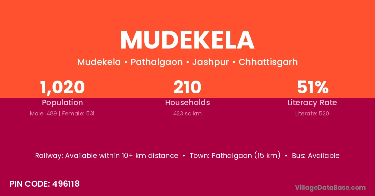 Mudekela village has a total population of 1,020 people, of which 489 are males and 531 are females.