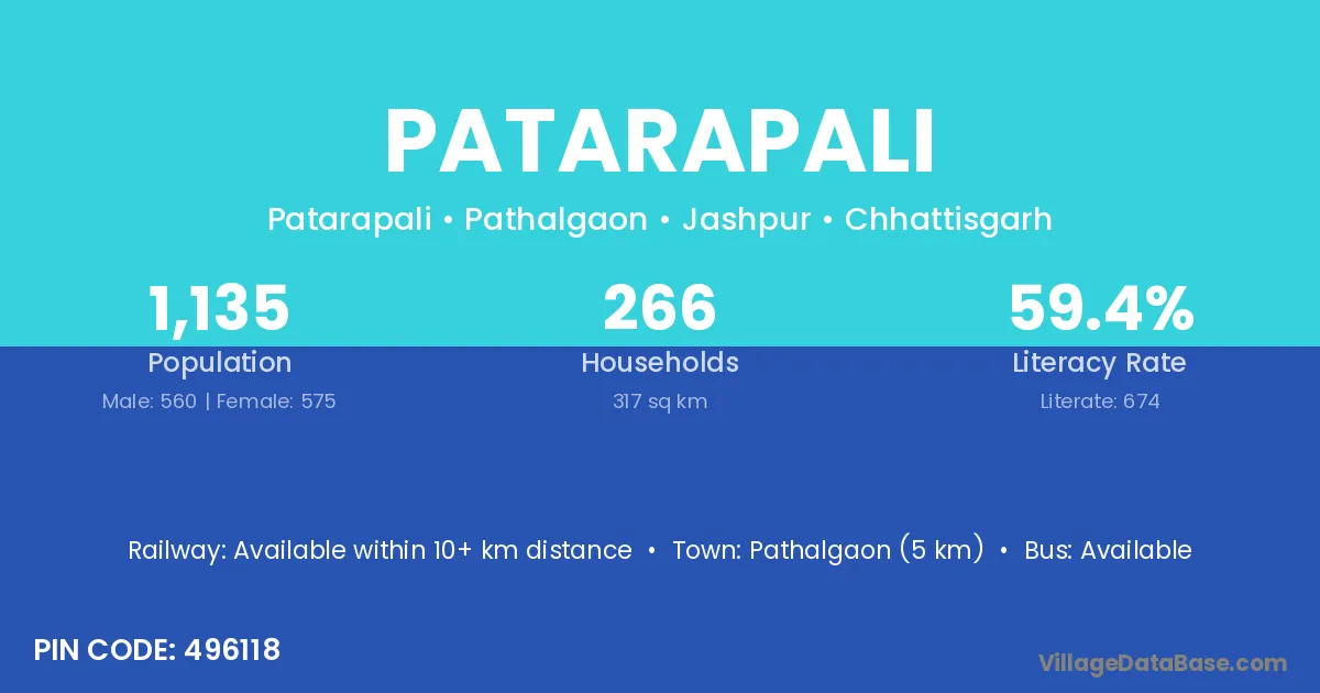 Pathalgaon (5 km) is the nearest town to Patarapali village for major economic activities and is located approximately 5 km away.