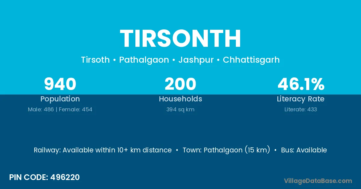 Pathalgaon (15 km) is the nearest town to Tirsonth village for major economic activities and is located approximately 15 km away.