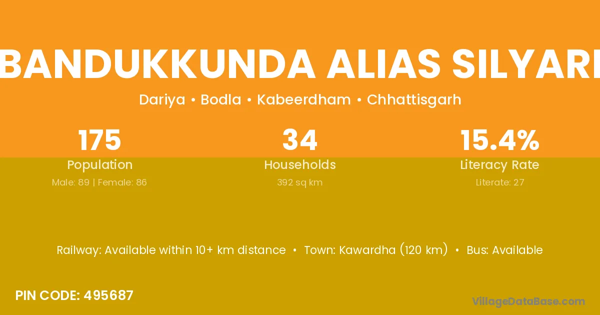 Kawardha (120 km) is the nearest town to Bandukkunda Alias Silyari village for major economic activities and is located approximately 120 km away.