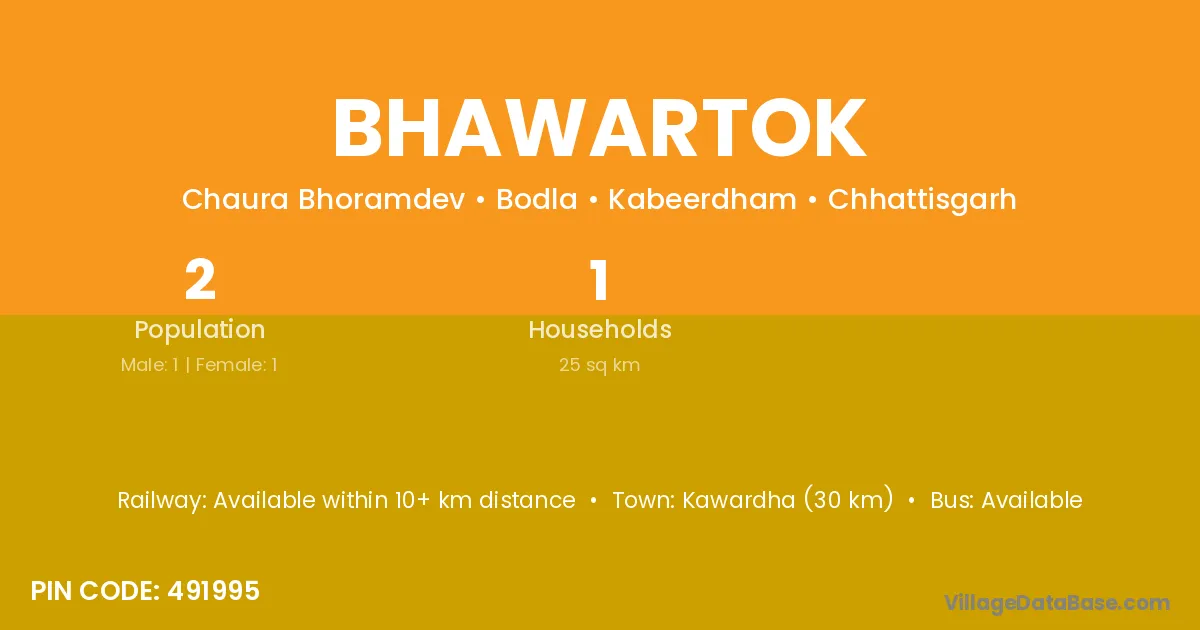 Kawardha (30 km) is the nearest town to Bhawartok village for major economic activities and is located approximately 30 km away.