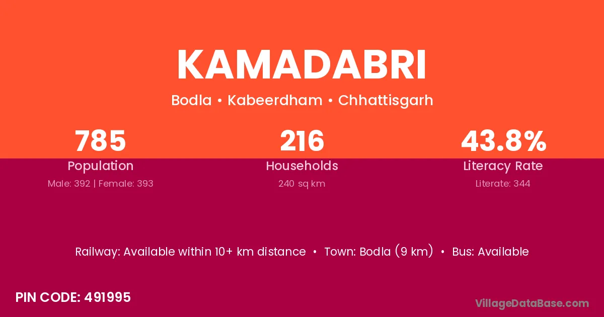 Kamadabri village has a total population of 785 people, of which 392 are males and 393 are females.