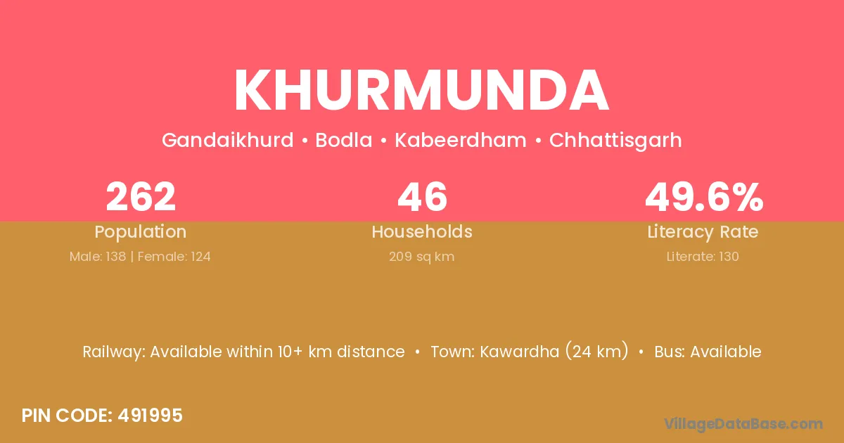 Kawardha (24 km) is the nearest town to Khurmunda village for major economic activities and is located approximately 24 km away.
