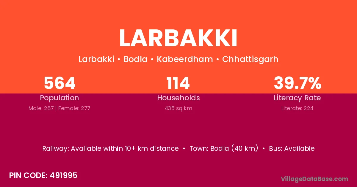 Bodla (40 km) is the nearest town to Larbakki village for major economic activities and is located approximately 40 km away.