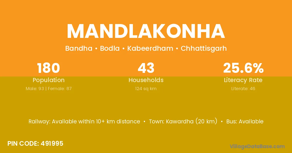 Kawardha (20 km) is the nearest town to Mandlakonha village for major economic activities and is located approximately 20 km away.