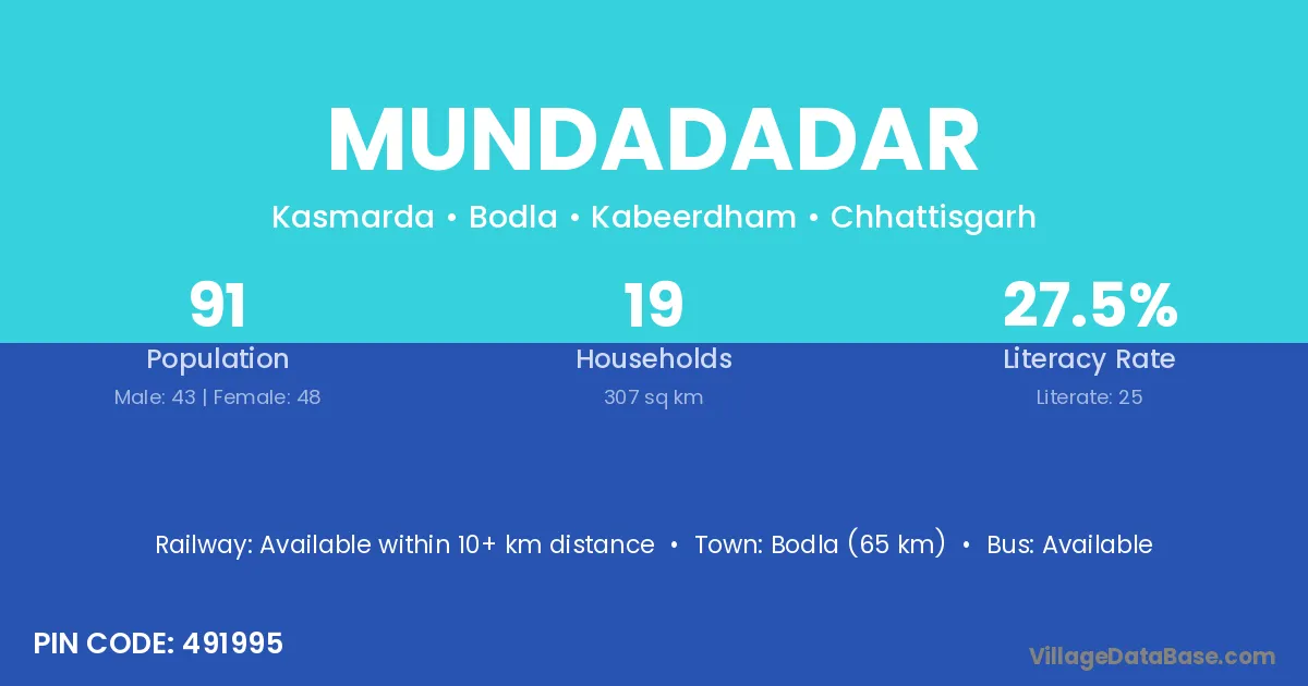 Bodla (65 km) is the nearest town to Mundadadar village for major economic activities and is located approximately 65 km away.